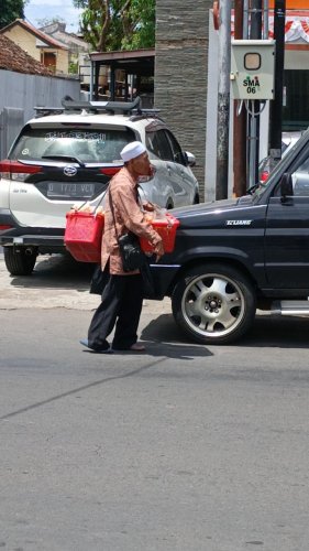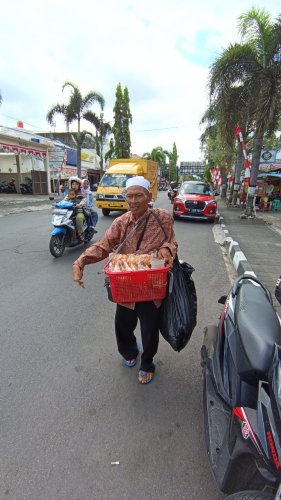 Setiap pagi, Abah Uyung (50 tahun) menggendong dagangan sistik dan kerupuk di tangannya yang cacat, lalu mulai berjalan perlahan menyusuri jalan kampung.