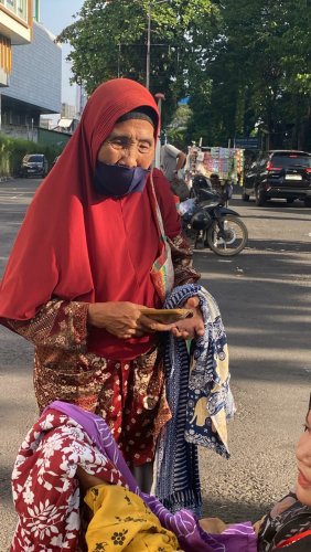 Di pundaknya tergantung beberapa daster sederhana, hasil dari titipan atau modal kecil yang bisa beliau kumpulkan. Mbah Muninggar biasa menawarkan dagangannya kepada siapa saja yang ia temui di jalan—entah orang yang sedang duduk, lewat, atau bahkan sekadar berhenti sebentar.