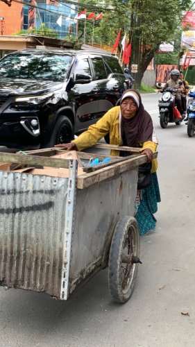 Setiap pagi pukul 7, Mbah Rustini yang sudah berusia 65 tahun mendorong gerobaknya menyusuri jalan dan gang kota untuk mencari barang bekas.