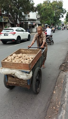 Berkeliling ke jalan raya hingga ke desa yang nanjak berharap ada orang yang beli dagangannya.