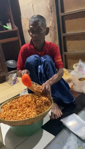 Abah Amir (78) masih berjualan makaroni dan lidi makanan setiap hari, meski ia sudah tidak bisa berjalan dan harus diangkat oleh orang lain untuk pergi bekerja. Penyakit tulang yang dialaminya sejak 9 bulan lalu membuat kakinya tidak bisa diluruskan dan tubuhnya sulit digerakkan. Saat berjualan pun ia hanya bisa duduk diam menahan sakit.