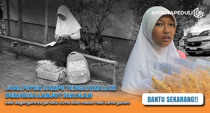 Dek Ranisa baru berusia 12 tahun. Seharusnya di umur itu ia pulang sekolah, berganti baju, lalu bermain atau belajar di rumah. Tapi setiap siang hingga malam, Ranisa justru berdiri di pinggir jalan Griya Arcamanik, menjajakan peyek bersama ibu dan adiknya yang masih berusia 6 tahun.